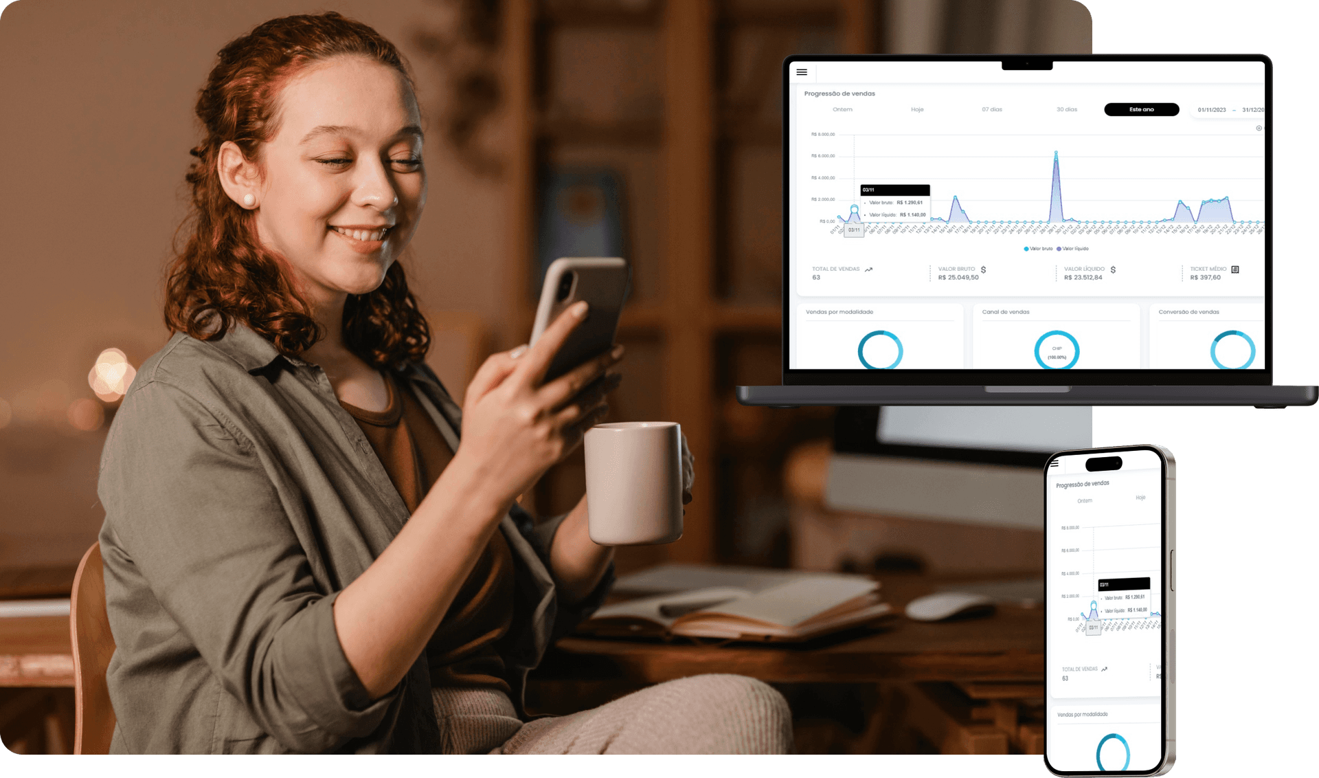 Acompanhe os principais indicativos de sucesso do seu negocio: Faturamento, Ticket Médio, Volume de Vendas, Cobranças.
